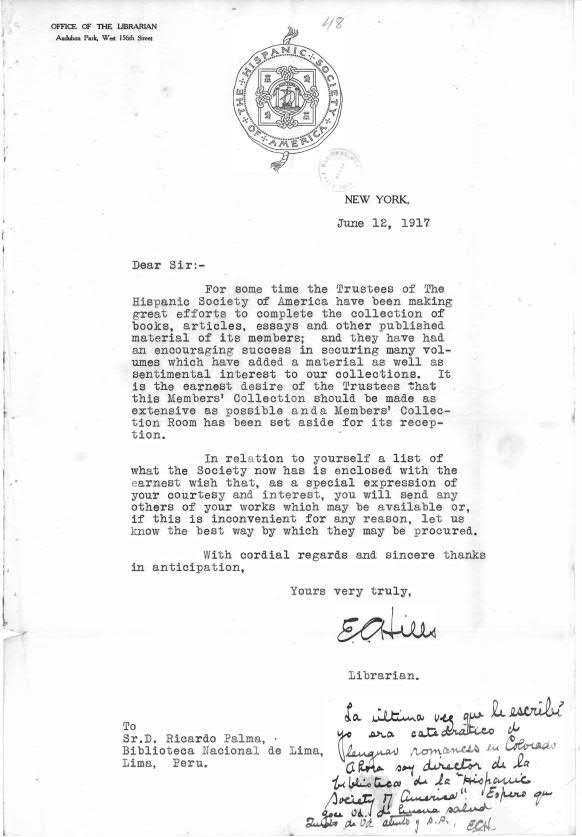 - [Carta de E.C. Hills, New York; para Ricardo Palma, Lima](1917 junio 12) Hills, Elijah Clarence, 1867-1932Dice que por algún tiempo los directores de la Hispanic Society of America, han hecho grandes esfuerzos para completar las colecciones de libros, artículos, ensayos y otras publicaciones de sus miembros y han tenido un alentador éxito. Informa que en relación a Uds. está adjuntando una lista con el especial deseo de su cortesía y de su interés, para que los libros que aparecen en ella se los envíen ; también les pide que envíen cualquier otros trabajos que podrían estar disponibles.