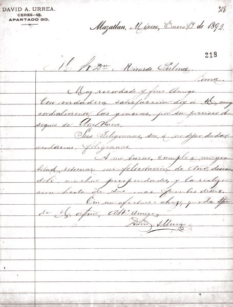 - [Carta de David A. Urrea. 1892 enero 19, Mazatlán; para Ricardo Palma, Lima](1892) Urrea, David A.Carta de David Antonio Urrea dirigida a Ricardo Palma, sobre la muestra de agradecimiento por el obsequio de Año Nuevo y los elogios para la obra "Filigranas".